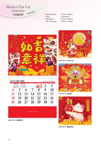 Medium Pak Fok Calendar ⃰䥁䱒㧋♉ EMPF4500 Calendar Size: 127mm x 78mm Page: 12 sheeters Adv Space: 127mm x 30mm Adv Text Area: 110mm x 20mm (03) 洯ㄷ⯪⛌ (03) 忥䰡⓳ Advertisement space (03) 葺蠼⛌䰨 (03) ⺏忸誜∜ 52