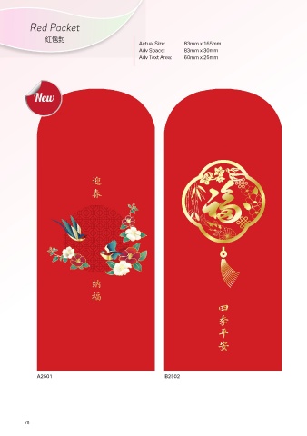 Red Packet 入◈⻄ Actual Size: 83mm x 165mm Adv Space: 83mm x 30mm Adv Text Area: 60mm x 25mm A2501 B2502 78